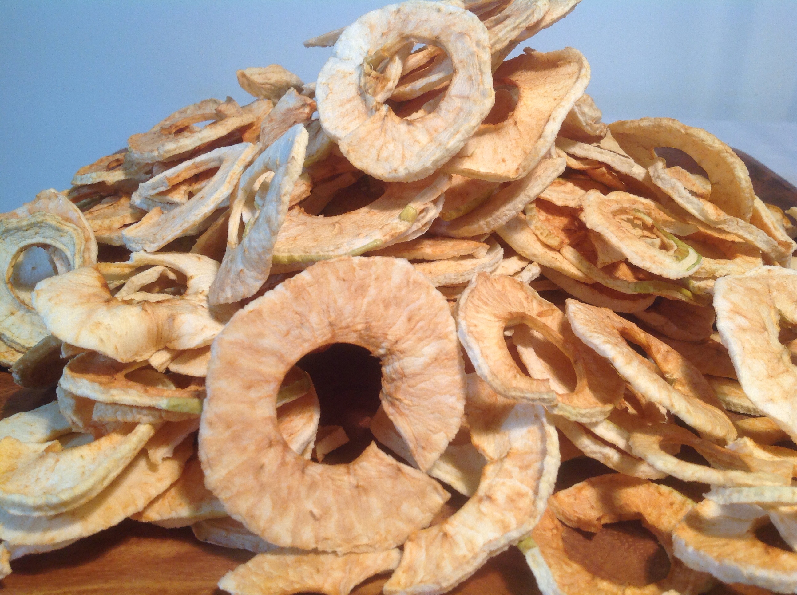Nu er det ikke, fordi jeg hverken vil eller kan konkurrere på udstyr, men jeg har anskaffet mig en dehydrator, altså en tørremaskine, som kan tørre hvad som helst. Hold da op, det fungerer godt. Den bruger for 50 øres strøm i timen og den passer sig selv – her har jeg lavet æbleringe, de kan holde sig et års tid…….hvis man kan lade dem være……