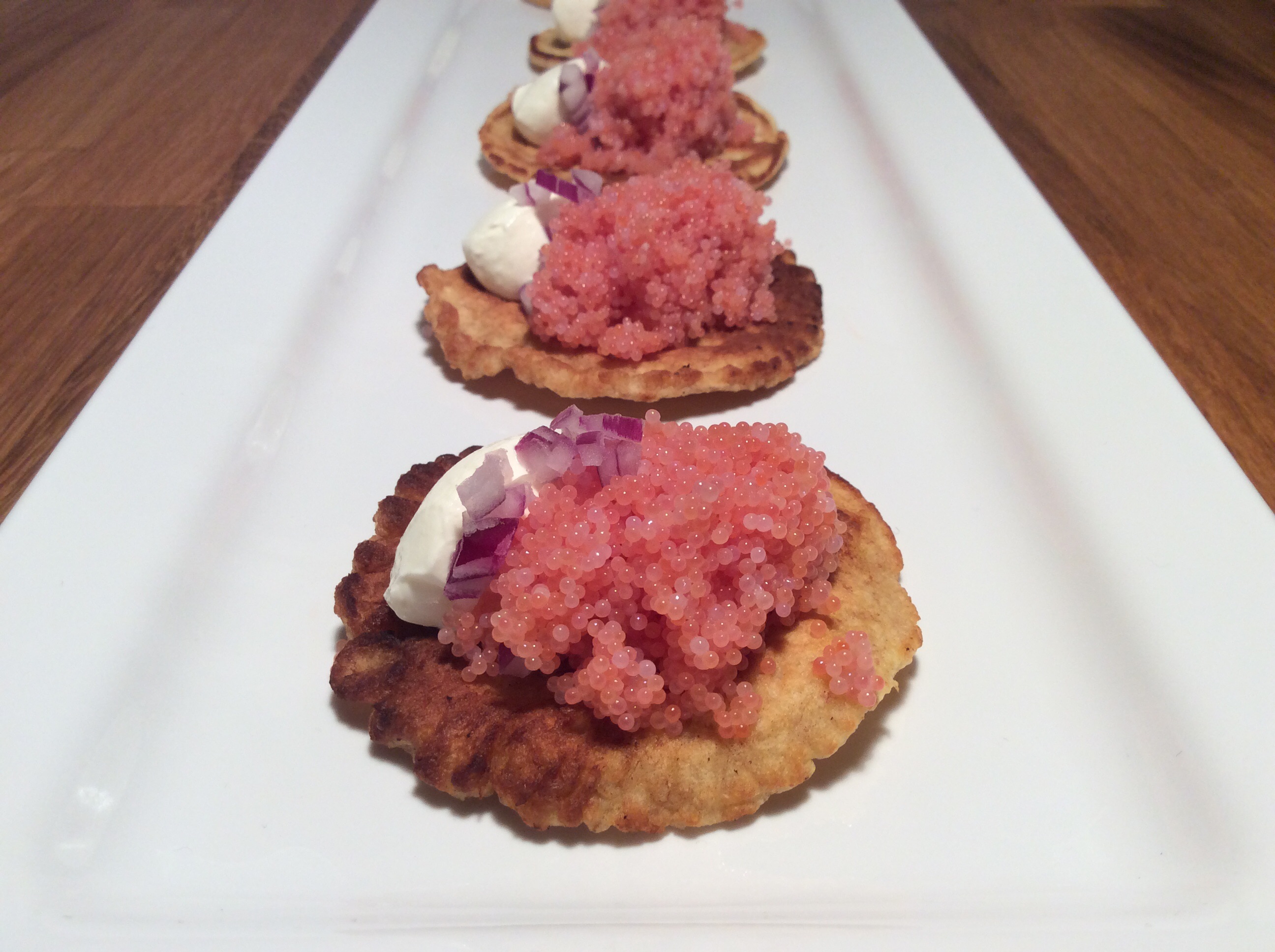 De færdige blinis toppes med frisk stenbiderrogn, finthakkede rødløg og creme fraiche.