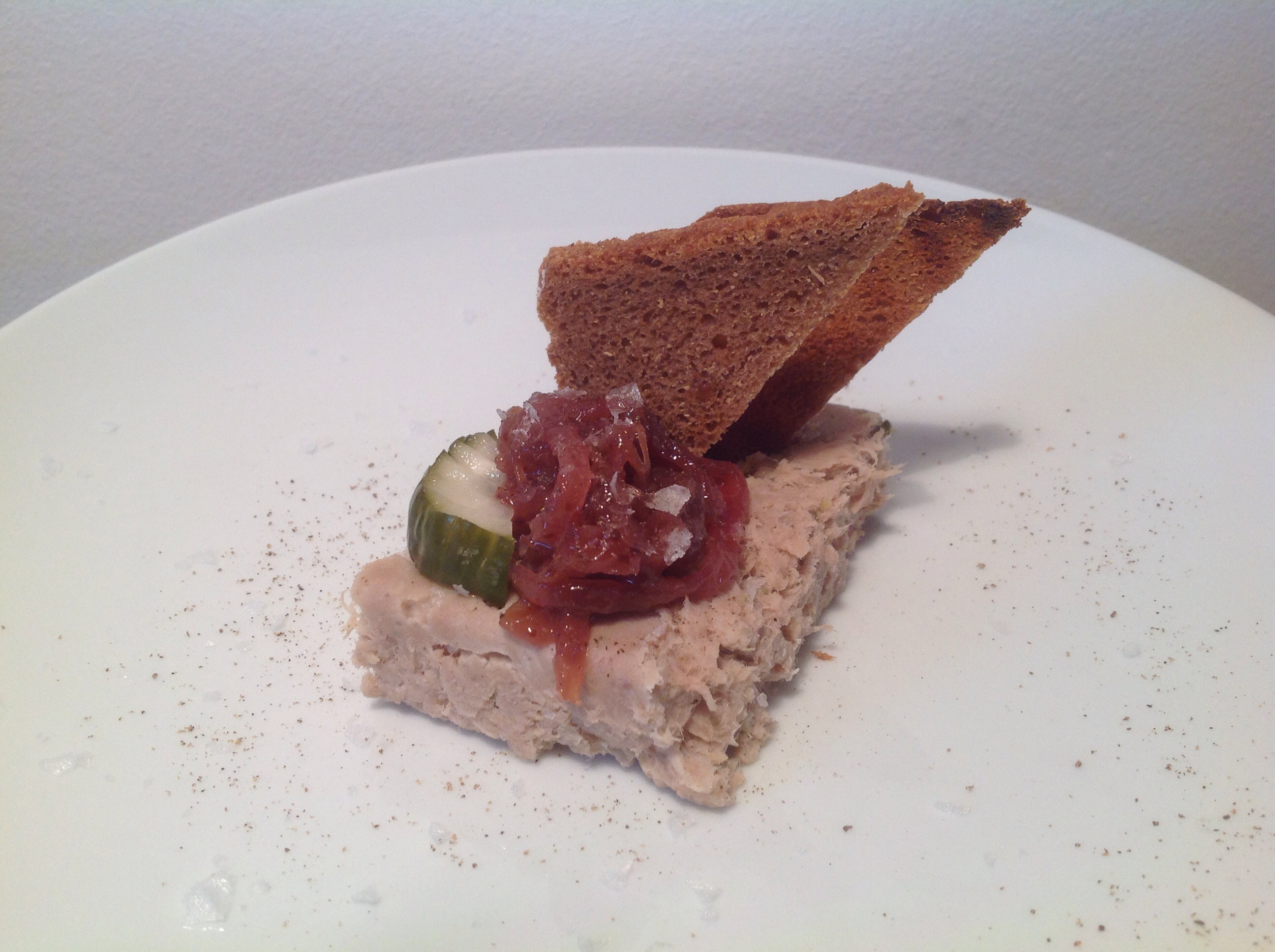 Man tager en nakkefilet og skærer den i små tern, 2 x 2 cm. Putter dem i en gryde og dækker til med en tør hvidvin. Hakker et par skalotteløg og tilsætter. Kaster et par rosmarin stilke i, og så skal det simre til kødet falder fra hinanden. Det tager ca. et par timer. Derefter sies kødet og læsses op i røremaskinen. Det æltes til en homogen masse mens man spæder væsken til. Smages til med salt og peber. Massen kommes i forme og på køl. Smager fantastisk på ristet rugbrød med løgkompot.